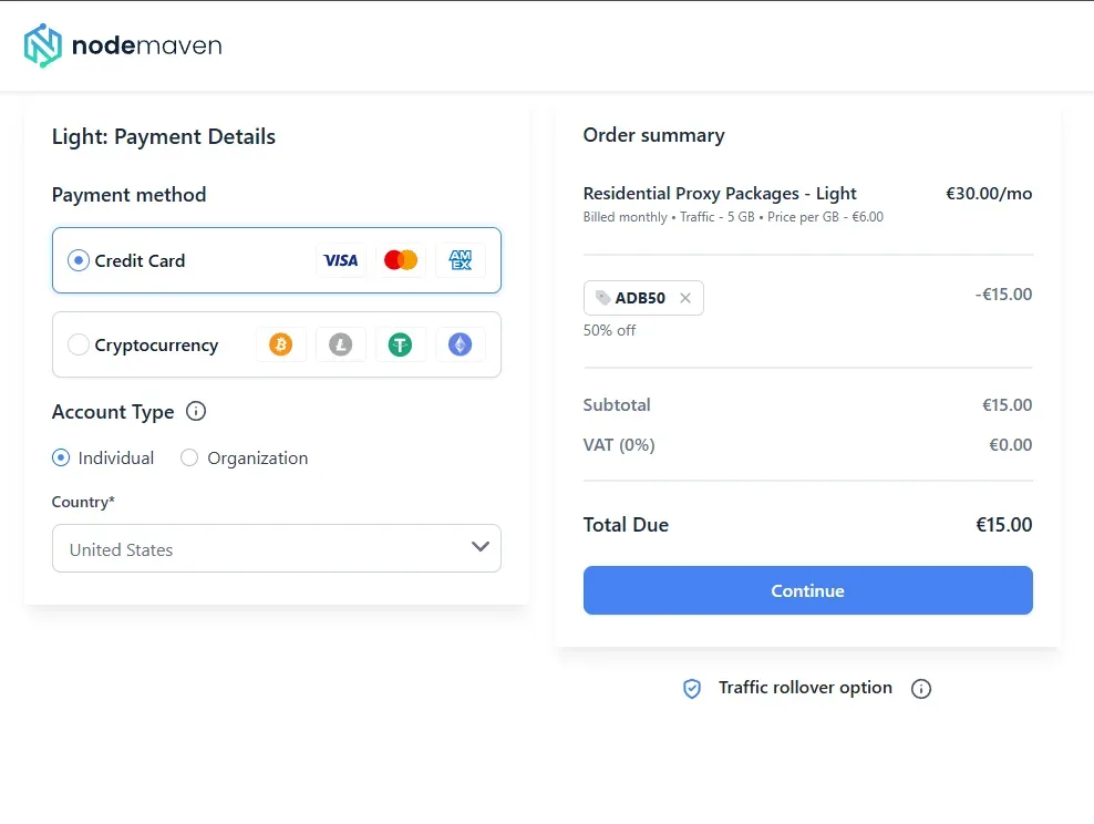 Simply hit the ADBLogin link, pick your preferred proxy plan, and apply the ADB or ADB50 code at checkout. That’s it! You’ll have NodeMaven’s clean IPs, long sticky sessions, and unbeatable prices at your fingertips.